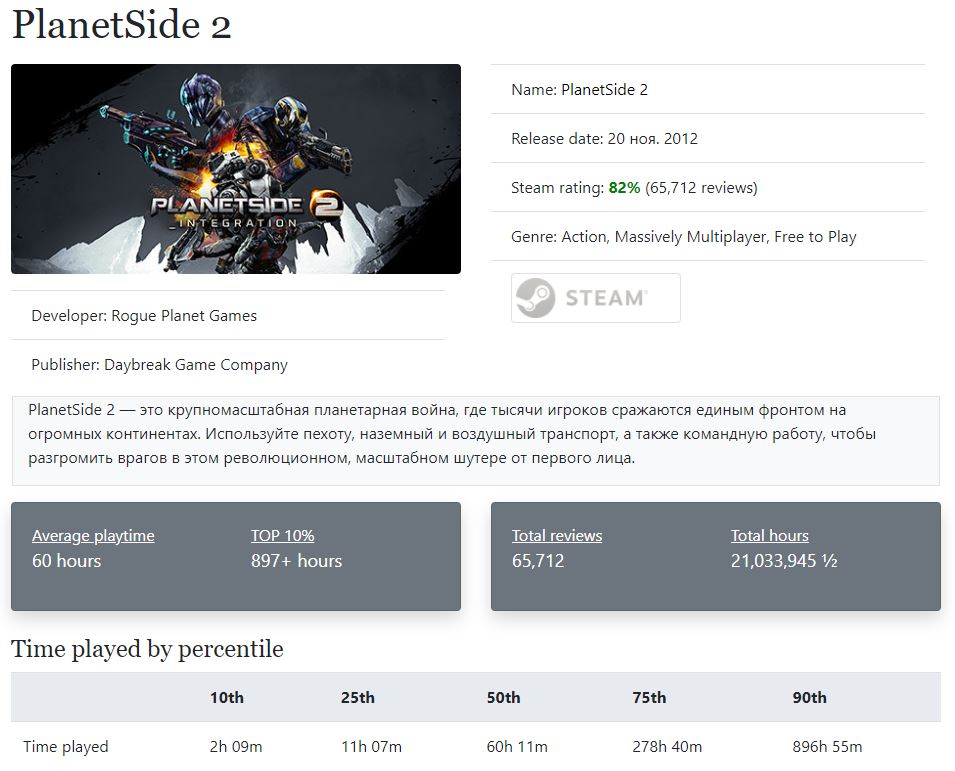 In theory most games have most players centered around some distribution. My original thought was some kind of normal distribution centered around the median playtime. This further motivates: is my Planetside 2 gameplay time above or below that median?